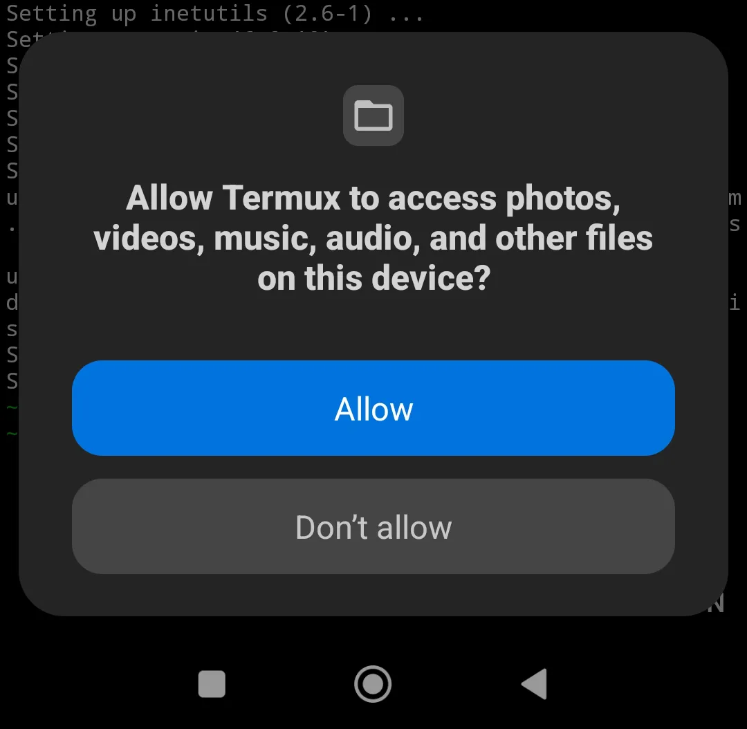 Următorul pas esențial este acordarea accesului la stocarea internă a telefonului. Fără această permisiune, Termux va funcționa într-un mediu izolat, fără a putea citi sau scrie fișiere în directoare precum Downloads