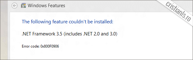Imediat după instalarea Windows 8.1 build 9471 am început să instalezi programele de care am nevoie zilnic. Unul dintre acestea, nu mai țin mint care, necesita .NET Framework 3.5 pentru a funcționa, dar a cărui instalare automată nu a fost posibilă, acțiunea raportând eroare 0x800F0906: