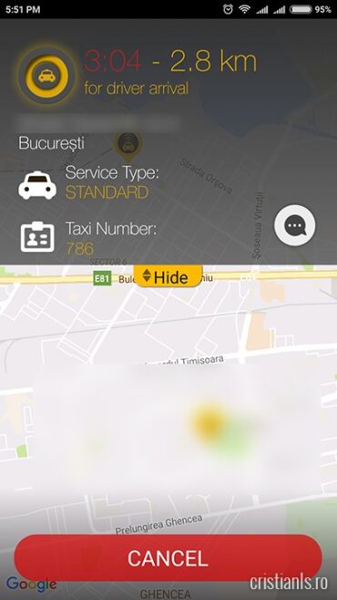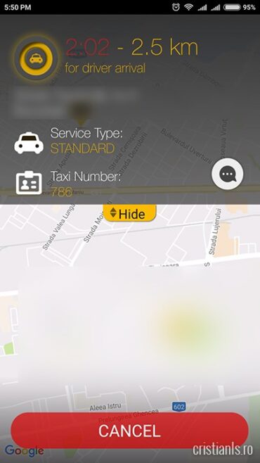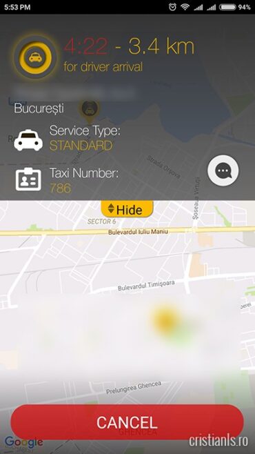 Aș mai vrea și posibilitatea de chat cu șoferul. Nu doar alea trei mesaje stupide. Presupun că nu vreți ca șoferul să tasteze, e OK, dar măcar lăsați-mă pe mine să-i spun c-a ajuns la blocul din spatele sau din fața blocului meu, că e penibil să ne căutăm reciproc, iar chestia asta se întâmplă, deja, aproape de fiecare dată când chem un taxi!