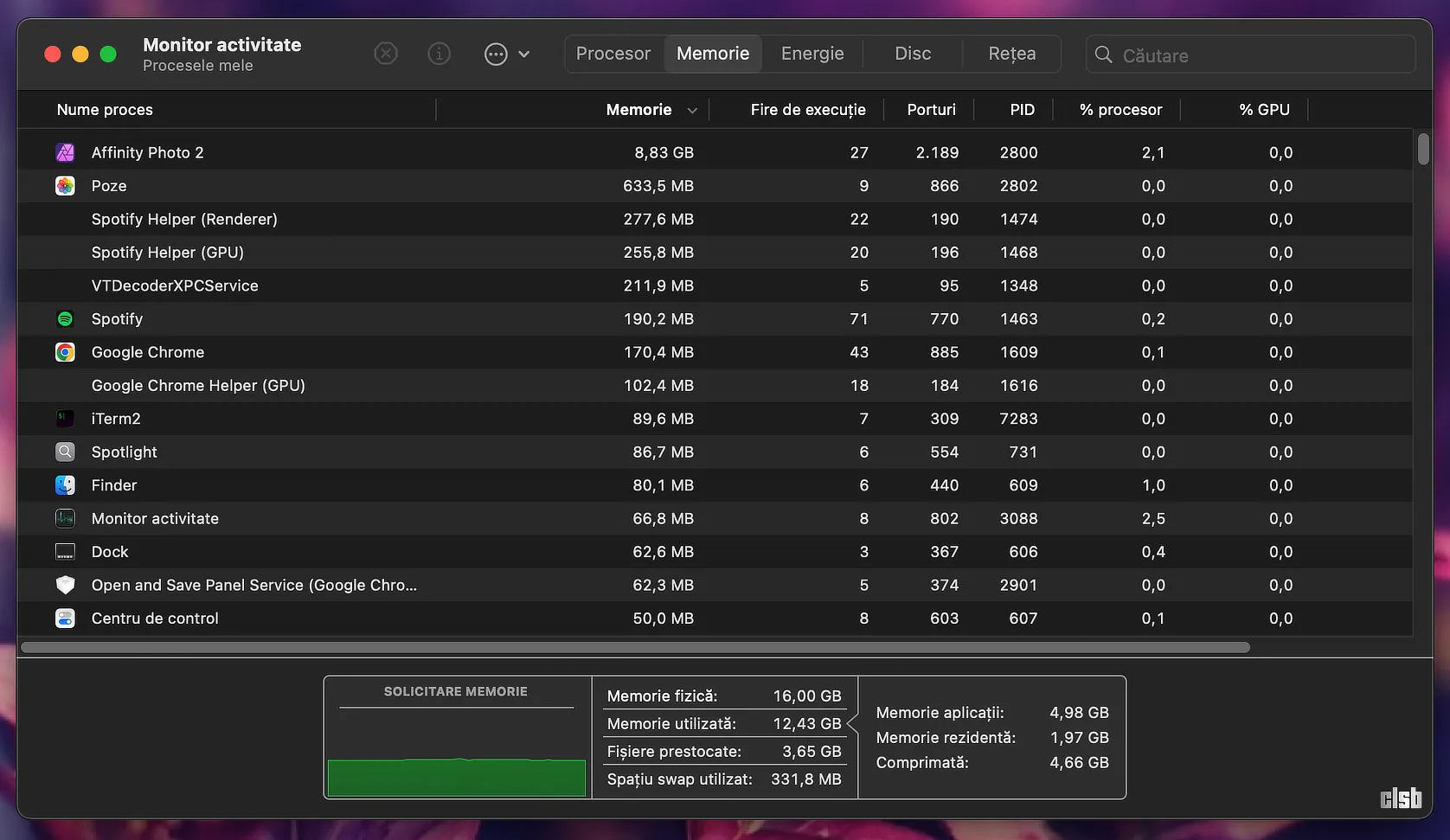 Când avem zeci de file deschise în browser și multiple poze în editorul foto, ar fi înțelept să aruncăm o privire în Monitorul de Activitate. Dacă observăm că sistemul folosește intens memoria cache sau swap, este un semn clar că ar trebui să mai închidem din tab-urile de care nu mai avem nevoie sau din fotografiile deja editate și exportate. Personal, mi se întâmplă des să uit zeci de tab-uri deschise, până când abia le mai pot distinge, deși știu că cei 16 GB de RAM ai computerului sunt o resursă limitată. O bună igienă digitală poate evita necesitatea unui upgrade și, mai important, poate prelungi viața SSD-ului.