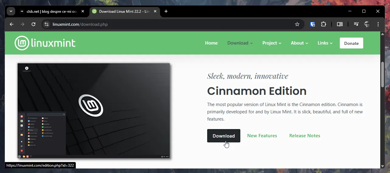 Înainte de orice, trebuie să descărcați imaginea ISO a discului de instalare de pe site-ul oficial. Vă recomand versiunea Cinnamon, cea pe care o folosesc și eu. Dacă sistemul dumneavoastră dispune de mai mult de 4 GB de memorie RAM, asigurați-vă că ați ales varianta de 64 de biți pentru a beneficia de întreaga putere de procesare.