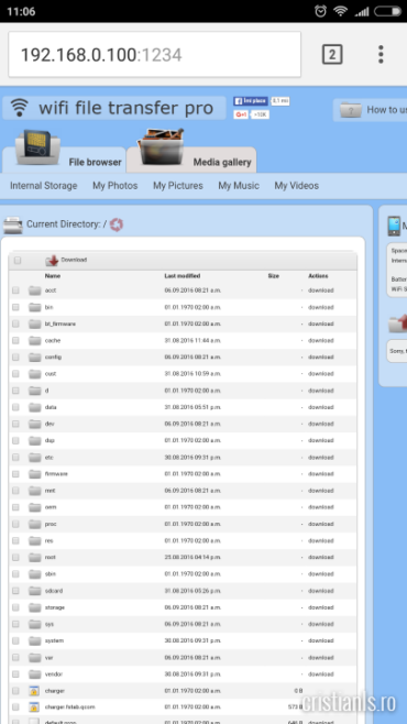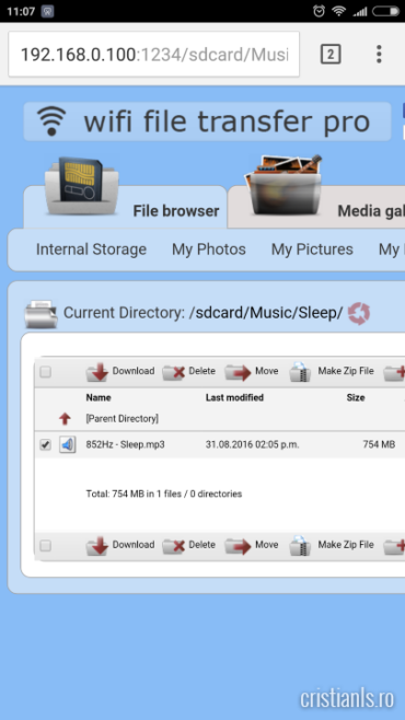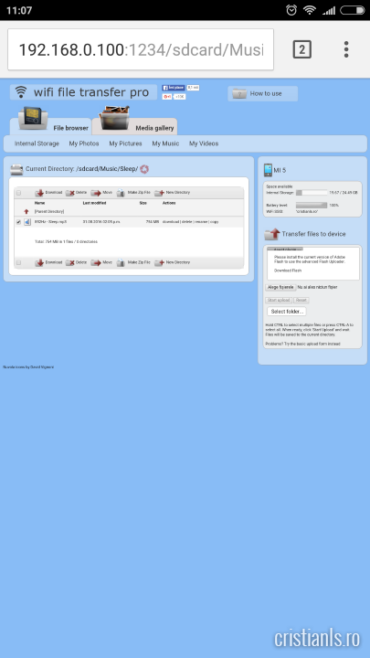 Prima dată am încercat transferul prin Bluetooth, dar am renunțat văzând că e nevoie de câteva ore pentru finalizarea operației. Așa am ajuns la WiFi File Transfer Pro, o aplicație pentru Android care permite transferul prin Wi-Fi a oricărui tip de fișiere.