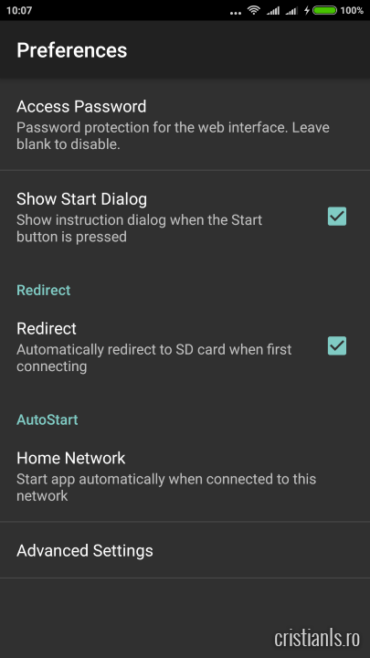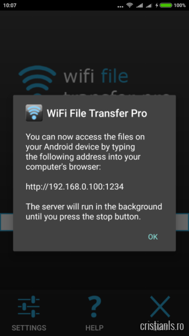 După conectarea la aceeași rețea, se apasă butonul Start și se urmează instrucțiunile pentru efectuarea transferului. Tot ce aveți de făcut e să tastați în bara de adrese a browserului din celelalte dispozitive adresa IP și portul deschis de aplicație, apoi să descărcați de acolo, ca și cum de un site de download ar fi vorba, toate fișierele de care aveți nevoie.