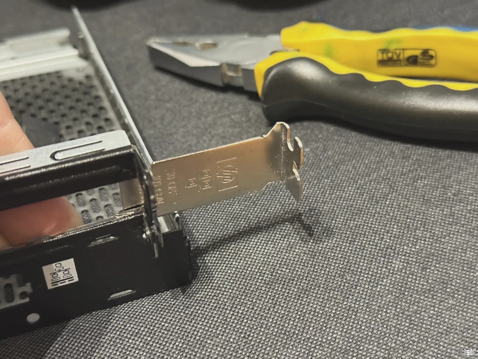 Am rezolvat rapid problema tăind bucata de care nu aveam nevoie. Partea rămasă am perforat-o și am prins-o temporar cu doi „șoricei” (zip ties) de carcasă. Spre surprinderea mea, soluția improvizată arată decent și, cel mai important, fixează placa foarte bine în slot.