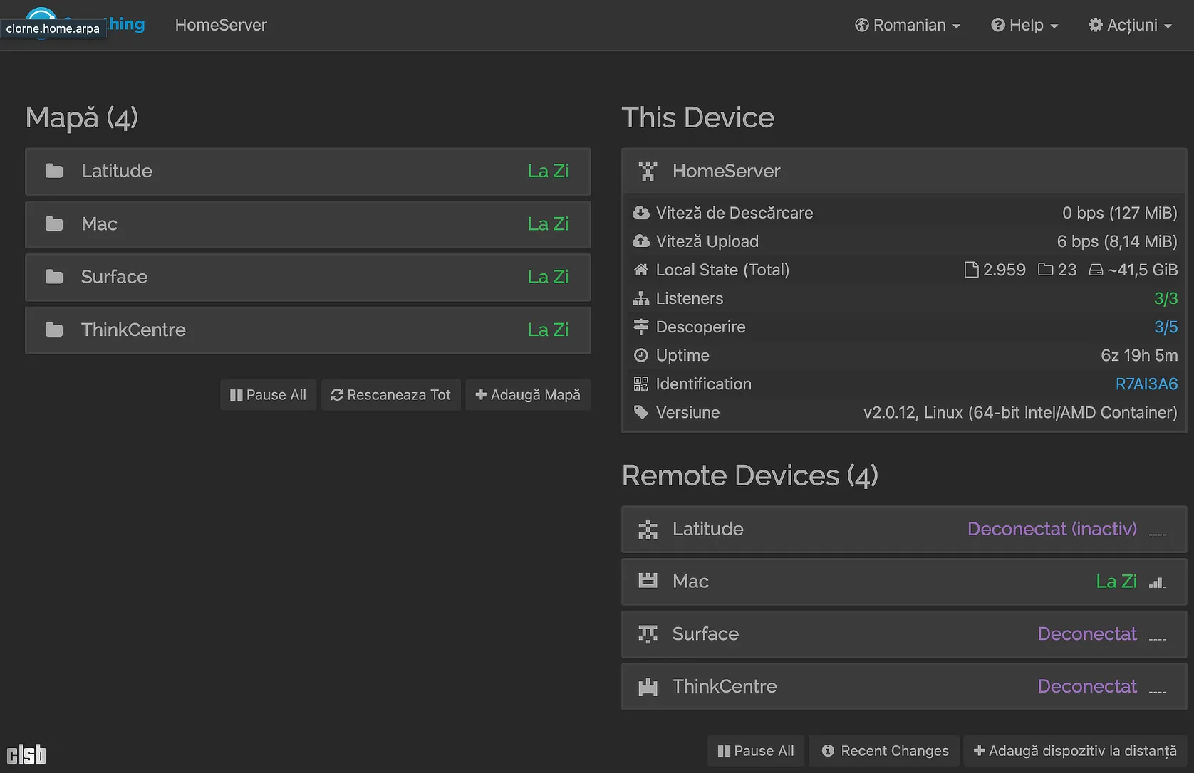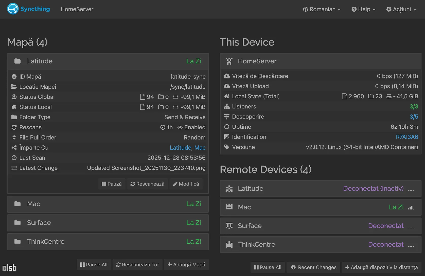 Apropo de fișiere, nu ți-ar fi mai ușor să lași respectivul HDD conectat permanent la un PC și să sincronizezi datele pe el cu Syncthing? Eu sincronizez documente, capturi de ecran și fundaluri între PC-uri cu ajutorul său. Am creat pe Home Server (în cazul tău poate fi PC-ul pe care-l folosești cel mai des) folder dedicat pentru fiecare PC, aici se vede mai bine, apoi am repatat local, pe fiecare PC în parte. Astfel, când lucrez pe Linux, dacă vreau ceva care știu că e pe mac ori surface, merg în folderul respectiv și-l iau de acolo, avantajul e că dacă fac modificări, am aceeași versiune peste tot.
