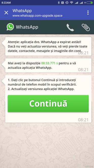 Astăzi am avut și eu parte de un mesaj phishing foarte bine împachetat, care mă anunța că mai am câteva secunde pentru a actualiza aplicația WhatsApp, altfel pierd contacte, mesaje și mesaje, un all inclusive, cum ar veni. Folosind Chromer, bara de adrese a browserului a fost mereu vizibilă și le-a stricat planurile încă din primul moment, altfel aș fi văzut pe ecran o interfața WhatsApp și nimic mai mult.