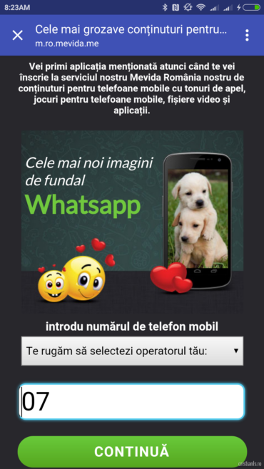 Pe principiul „Ce se poate întâmpla?!?”, am urmat pașii indicați în mesaj să văd unde ajung, și-am văzut… nișe căței călărind invitația de a le facilita numărul de telefon pentru a primi în schimb „aplicația menționată” atunci când mă voi înscrie la serviciul Mevida România.