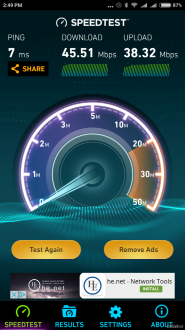 Următoarele teste efectuate având telefonul conectat direct la router n-au avut rezultate mai bune, ci unele similare. Sunt convins că diferențe s-ar fi simțit dacă conexiunea la Internet ar fi fost mai bună, dar deocamdată nu vă pot oferi mai multe detalii cu privire la acest aspect.