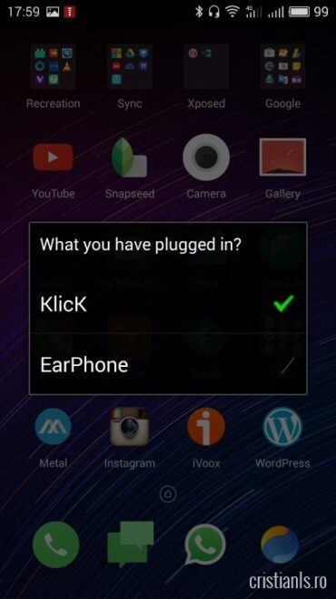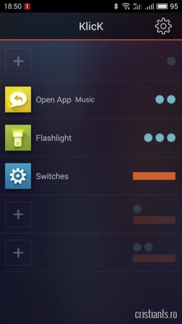 KlicK rulează în fundal și te întreabă, de fiecare dată când ai conectat ceva la jack-ul audio, dacă este vorba de butonul MiKey sau de căști. Permite configurarea a până la trei acțiuni pentru apăsări consecutive și altele două pentru „gesturi”, adică o combinație între apăsări scurte și lungi, care fie sunt vii și au toane, fie sunt OK și eu prea greu de cap pentru a putea înțelege exact cu se folosesc; cert este că uneori funcționează, alteori nu.