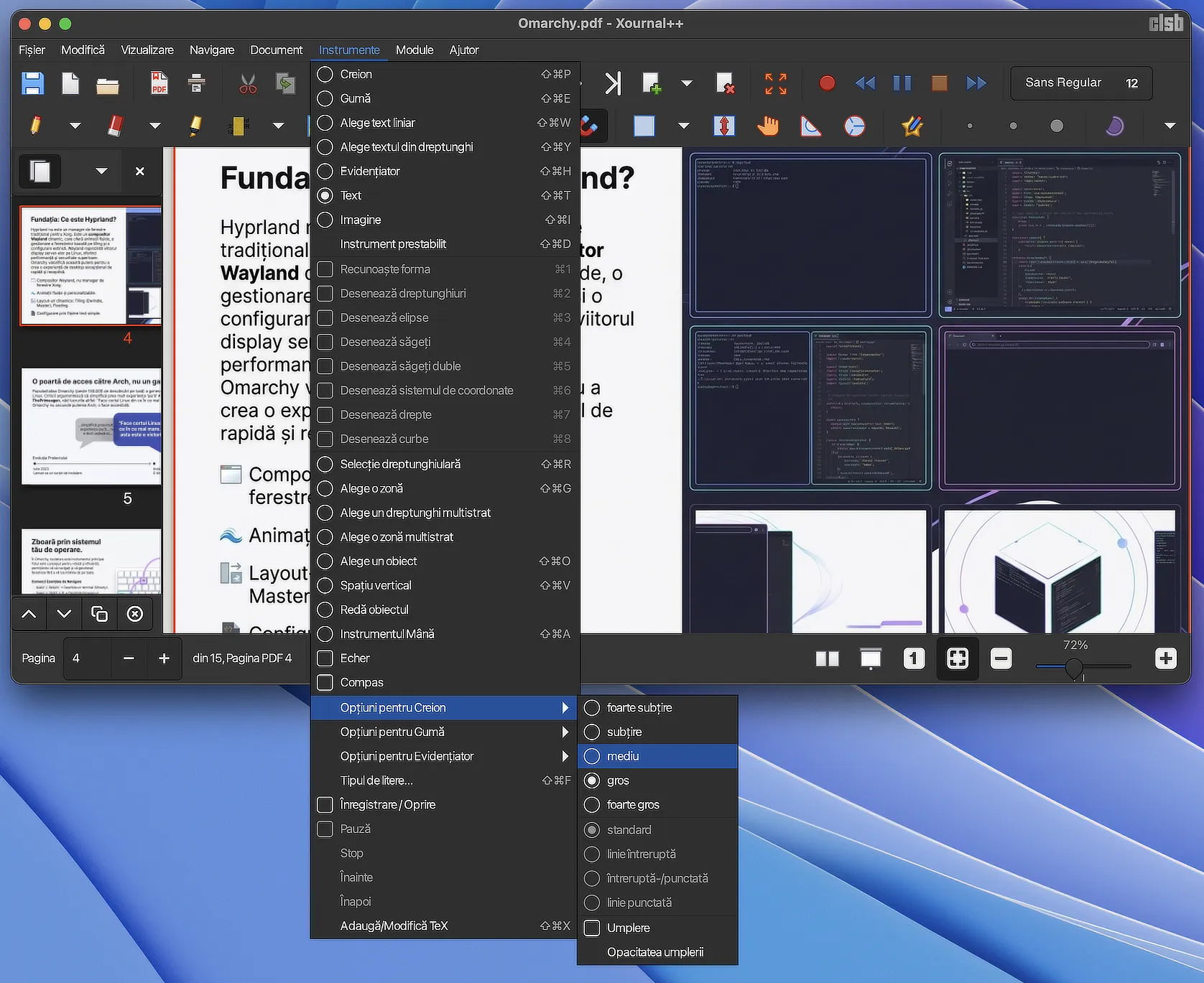 Dincolo de funcțiile de desen, Xournal++ impresionează prin multitudinea de instrumente de editare disponibile direct în bara de meniu, care poate fi personalizată după nevoi. De la diverse tipuri de stilouri și radiere, la instrumente de selecție și inserare de text, ai la îndemână tot ce îți trebuie pentru a crea documente complexe sau pentru a adnota rapid un fișier existent.