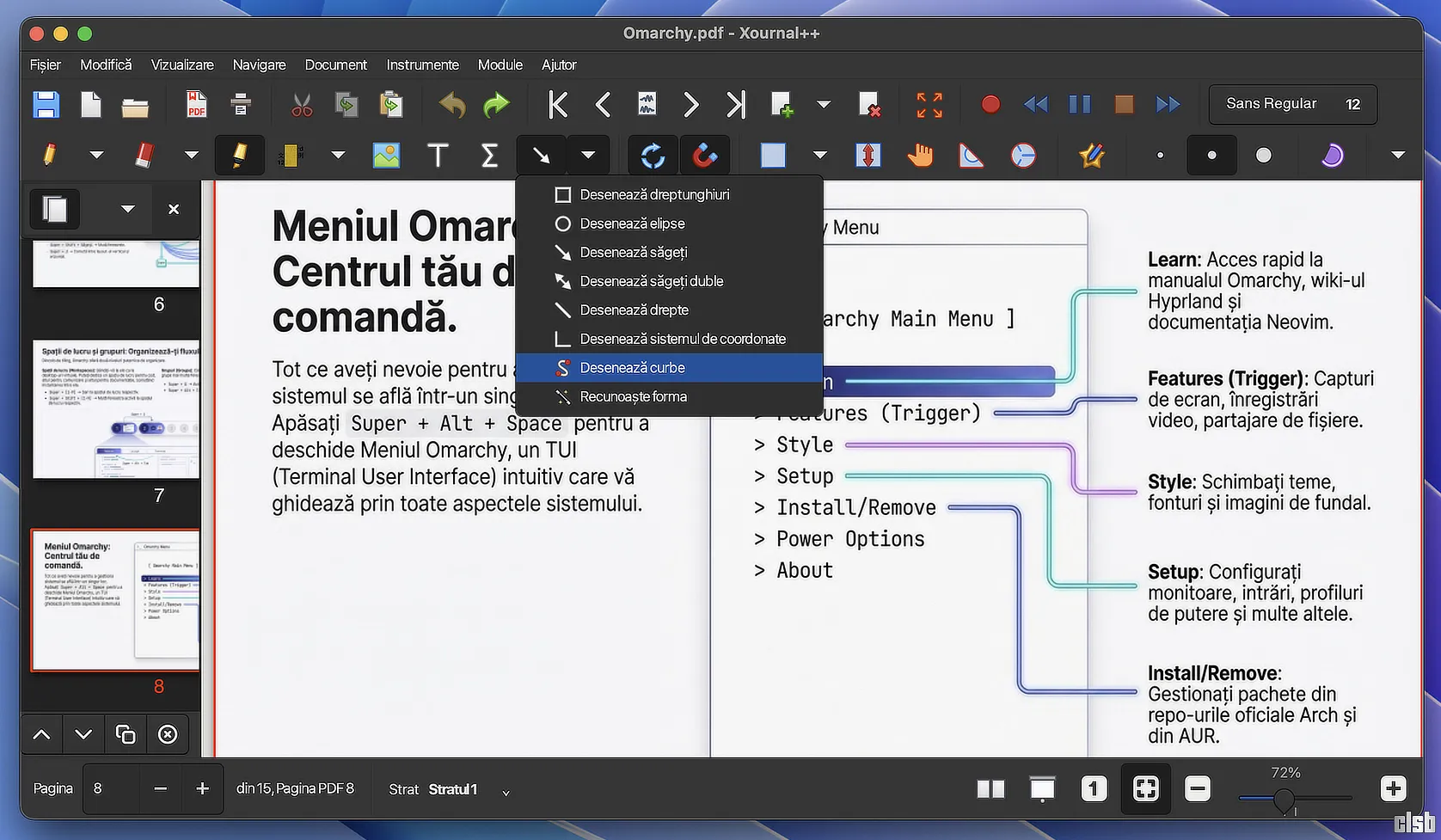 În Xournal++, layerele îți permit să plasezi notițele pe un strat și evidențierile pe altul, permițându-ți să ascunzi adnotările atunci când ai nevoie de o vizualizare curată a textului original. În plus, instrumentul de recunoaștere a formelor îți „curăță” desenele dezordonate făcute de mână, transformându-le instantaneu în linii, cercuri și dreptunghiuri perfecte, util mai ales când faci schițe tehnice rapide.